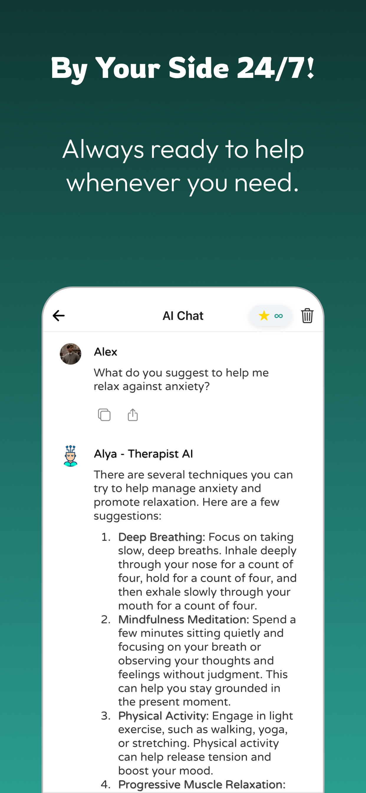 I love using Alya for my mental health needs. It provides excellent support and helps me manage my anxiety effectively.