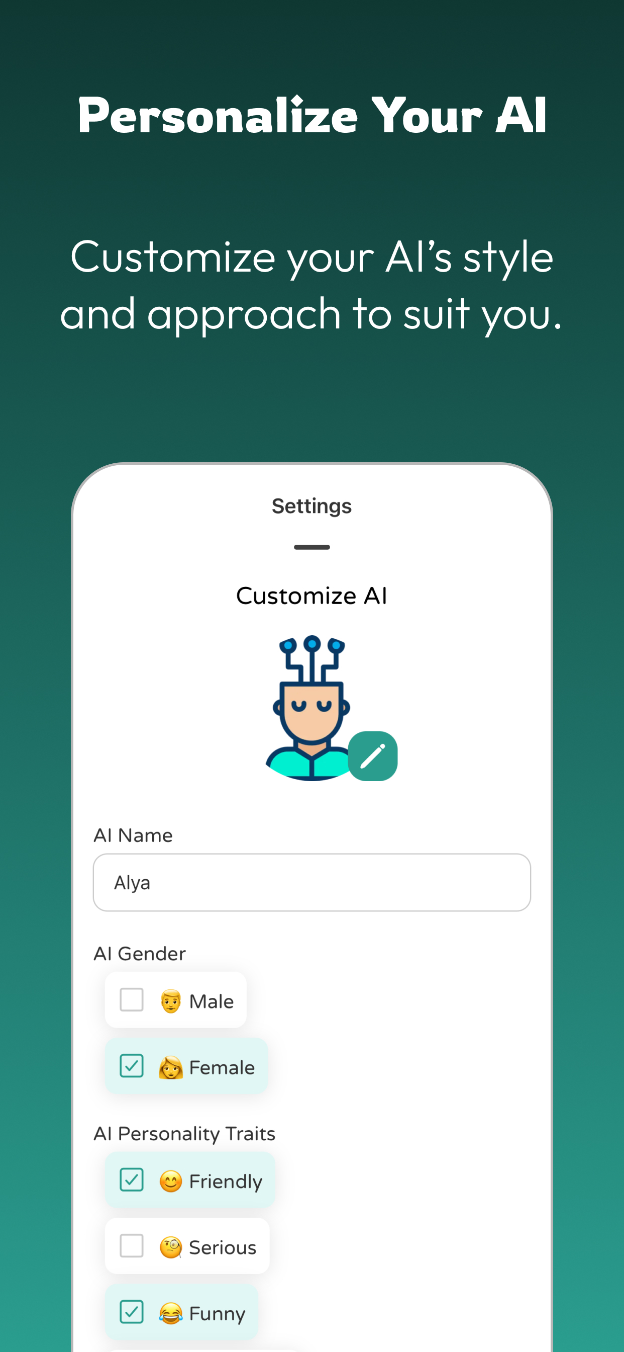 Take control of your mental health with Alya. Start managing your stress, anxiety, and personal growth today with our AI-powered therapy chat app.